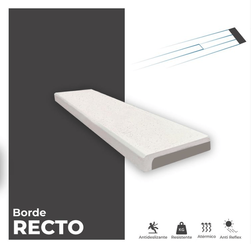 Borde Deck recto de líneas suaves y solidas, elegante y sobrio, esta pieza jerarquiza el perímetro de la piscina. Compatible con la linea de listones de deck como así también con la linea de solarium travertino.