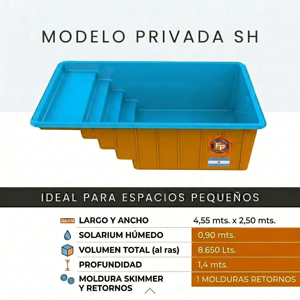 Pileta de fibra Modelo Privada Solarium Humedo 4.55 x 2,5